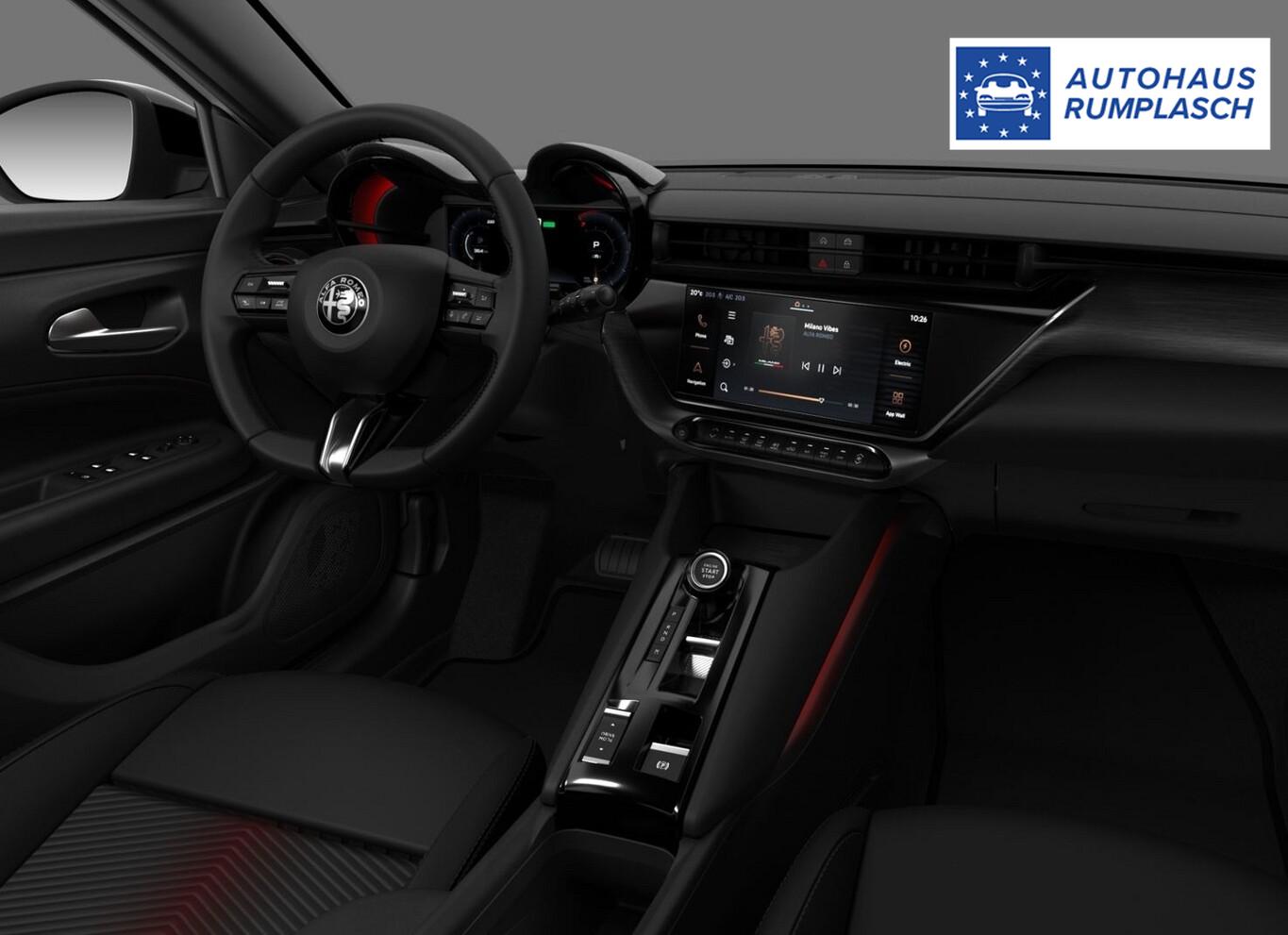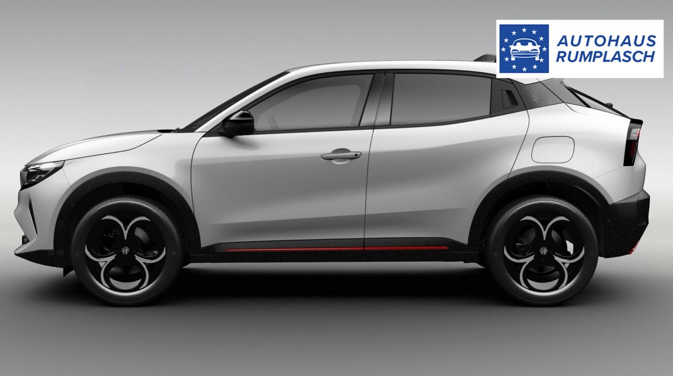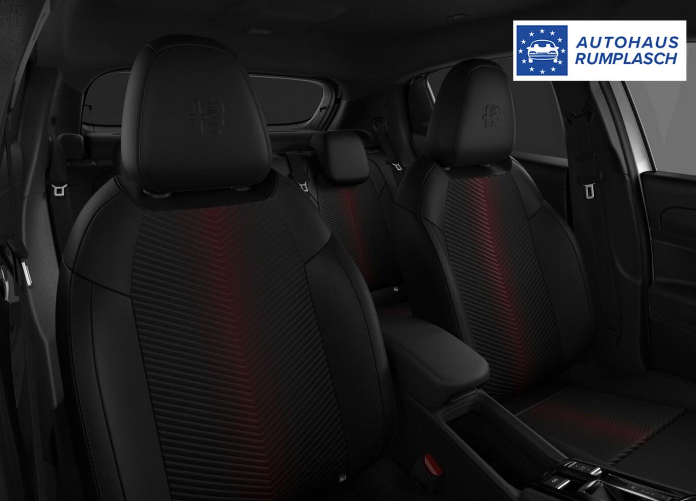 Ambiente-Beleuchtung LED, Antriebsart: Frontantrieb, Fahrassistenz-System: Totwinkel-Assistent, Klimaautomatik, Kombiinstrument digital (10,25"), Lenkrad (Kunstleder, unten abgeflacht), LM-Felgen 18", Navigationssystem inkl. 10,1"-Touchscreen, 6 Lautsprecher, Reifen 215/55 R18, Schadstoffarm nach Abgasnorm Euro 6e (EU6 EA), Scheinwerfer LED, Seitenscheiben hinten und Heckscheibe abgedunkelt, Sitzbezug / Polsterung: Stoff/Kunstleder-Kombination, Taschen an den Vordersitzlehnen, Außenspiegel schwarz, glänzend, Innenraumbeleuchtung mit LED (zusätzlich), Karosserie: 5-türig, Mild-Hybrid 107 kW (Motor 1,2 Ltr. - 100 kW), Parkbremse elektrisch, Radstand Standard, Scheibenbremsen vorn und hinten, Türgriffe außen Wagenfarbe, Elektron. Traktionskontrolle, Getriebe 6-Gang - Doppelkupplungsgetriebe eDCT, Airbag Fahrer-/Beifahrerseite, Fensterheber elektrisch vorn + hinten, Keyless-Entry, Mittelarmlehne vorn, Rücksitzlehne geteilt/klappbar (60:40), Zentralverriegelung mit Fernbedienung, Kofferraumdeckel / Heckklappe elektr. betätigt Easy-Load (öffnen + schliessen), Adaptive Geschwindigkeitsregelanlage (Adaptive Cruise Control), Fahrassistenz-System: Verkehrszeichenerkennung (TSR), Rückfahrkamera mit 180° Umgebungsansicht, Außenspiegel elektr. verstell-, heiz- und anklappbar, Heckleuchten LED, Licht- und Regensensor, Tagfahrlicht LED, Einparkhilfe hinten, Fahrassistenz-System: aktiver Spurhalteassistent (LKA), Fahrassistenz-System: Alfa Romeo D.N.A.-Fahrdynamik-System, Fahrassistenz-System: Autonomer Notbrems-Assistent (AEB), Fahrassistenz-System: Müdigkeitserkennungs-Sensor (DAA), Start-Stop-Knopf