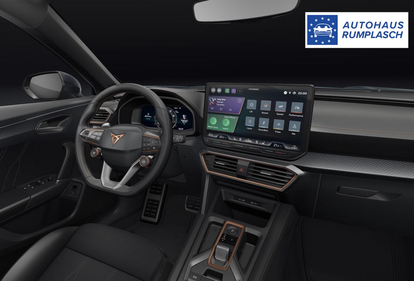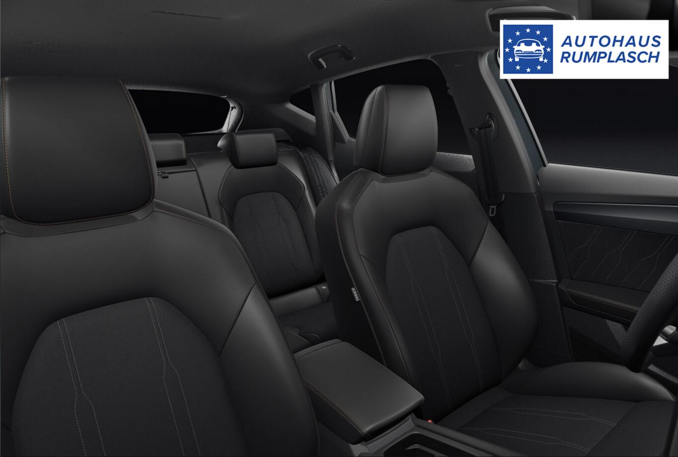 Edge-Paket (Ambiente-Beleuchtung LED / Ambiente-Beleuchtung Smart Ambient Light / Schließ-/Startsystem Kessy Advanced / Heckklappe/-Deckel elektr. betätigt (öffnen + schliessen, sensorgesteuert) / Rückfahrkamera / Diebstahl-Warnanlage mit Innenraumüberwachung und Abschleppschutz), Winter-Paket (Sitzheizung vorn), Anhängerkupplung Vorbereitung, Ablagetaschen an Vordersitzlehnen, Audio-Infotainmentsystem mit Touchscreen Farbbildschirm 12,9", Fahrassistenz-System: Ausweich- und Abbiegeassistent, Induktionsladeschale für Smartphone, Knieairbag vorn, LM-Felgen 8x18, Navigation in Verbindung mit dem Smartphone (über Apple Carplay / Android Auto /...), Navigationssystem Vorbereitung, Pedale Aluminium-Design, Reifen 245/45 R18, Schadstoffarm nach Abgasnorm Euro 6e (EU6 EA), Sprachsteuerungs-System, Tagfahrlicht, Wegfahrsperre elektrisch, Licht- und Sicht-Paket (Innenspiegel mit Abblendautomatik / Einschaltautomatik für Fahrlicht / Licht- und Regensensor / Lichtassistent (Coming Home, Leaving Home)), Voll-LED-Paket (Leuchtweitenregelung automatisch / Heckleuchten Voll-LED mit dynamischem Lichtband (Infinite Light) / Nebelscheinwerfer LED mit Abbiegelicht / Scheinwerfer Voll-LED), Abdeckkappen Außenspiegel Schwarz, Dachhimmel schwarz, Einstiegsleisten vorn beleuchtet, Fensterzierleisten schwarz, Gepäck-/Laderaumboden doppelt, Karosserie: 5-türig, Kombiinstrument digital (virtual cockpit), Lendenwirbelstütze Sitz vorn links, verstellbar, Lendenwirbelstütze Sitz vorn rechts, verstellbar, Leseleuchten hinten LED, Leseleuchten vorn LED, Mild-Hybrid 110 kW (Motor 1,5 Ltr. - 110 kW eTSI), Otto-Partikelfilter (OPF), Parkbremse elektrisch mit Auto-Hold-Funktion, Radioempfang digital (DAB+), Sitz vorn links höhenverstellbar, Sitz vorn rechts höhenverstellbar, Sitzbezug / Polsterung: Stoff/Kunstleder schwarz (Sharp Textil), Sonnenblende links mit Spiegel (beleuchtet), Sonnenblende rechts mit Spiegel (beleuchtet), Steckdose 230V im Gepäckraum, Warnanlage für Sicherheitsgurt-System, Full Link (MirrorLink, Apple CarPlay und Android Auto), USB-Ladeanschlüsse (2-fach, Typ C) für 2.Sitzreihe, USB-Schnittstelle vorn (2-fach, Typ C), Antriebsart: Frontantrieb, Elektron. Differentialsperre (XDS), Getriebe 7-Gang - Doppelkupplungsgetriebe DSG, Klimaanlage Climatronic 3-Zonen, Airbag Beifahrerseite abschaltbar, Airbag Fahrer-/Beifahrerseite, Fensterheber elektrisch vorn + hinten mit Komfortschaltung, Isofix-Aufnahmen für Kindersitz an Beifahrersitz und Rücksitz (inkl. i-Size-Kindersitze), Kopf-Airbag-System, Mittelarmlehne vorn, Rücksitzlehne geteilt/klappbar mit Mittelarmlehne und Durchladeeinrichtung, Seitenairbag, Seitenairbag vorn mitte (Central Airbag), Seitenscheiben ab 2.Sitzreihe und Heckscheibe dunkel getönt (Privacy Glass), Fahrassistenz-System: Fahrprofilauswahl (CUPRA Drive Profile), Dachreling schwarz, hochglänzend, Wärmeschutzverglasung, Fahrassistenz-System: Autom. Distanzregelung (ACC / PCC) mit vorausschauender Geschw.-Regelung, Fahrassistenz-System: Verkehrszeichenerkennung, Notrufsystem, Lenkrad heizbar (CUPRA Supersport, Leder) mit Multifunktion und Schaltfunktion, Außenspiegel elektr. verstell-, heiz- und anklappbar mit Spiegelabsenkung und Welcome Light, Fahrassistenz-System: Fernlichtassistent, Einparkhilfe vorn und hinten, Fahrassistenz-System: Müdigkeitserkennung, Fahrassistenz-System: Spurhalteassistent, Fahrassistenz-System: Umfeldbeobachtungssystem (Front assist) mit City-Notbremsfunktion, Reifenkontroll-Anzeige, Start/Stop-Anlage