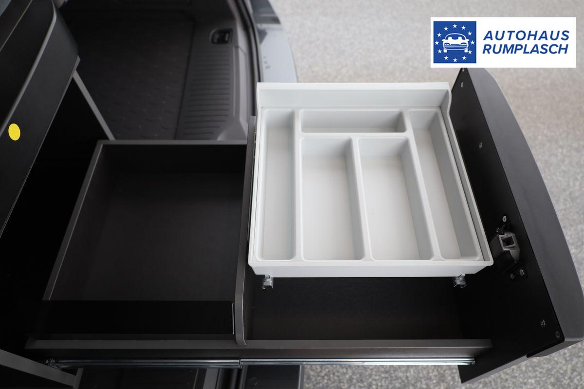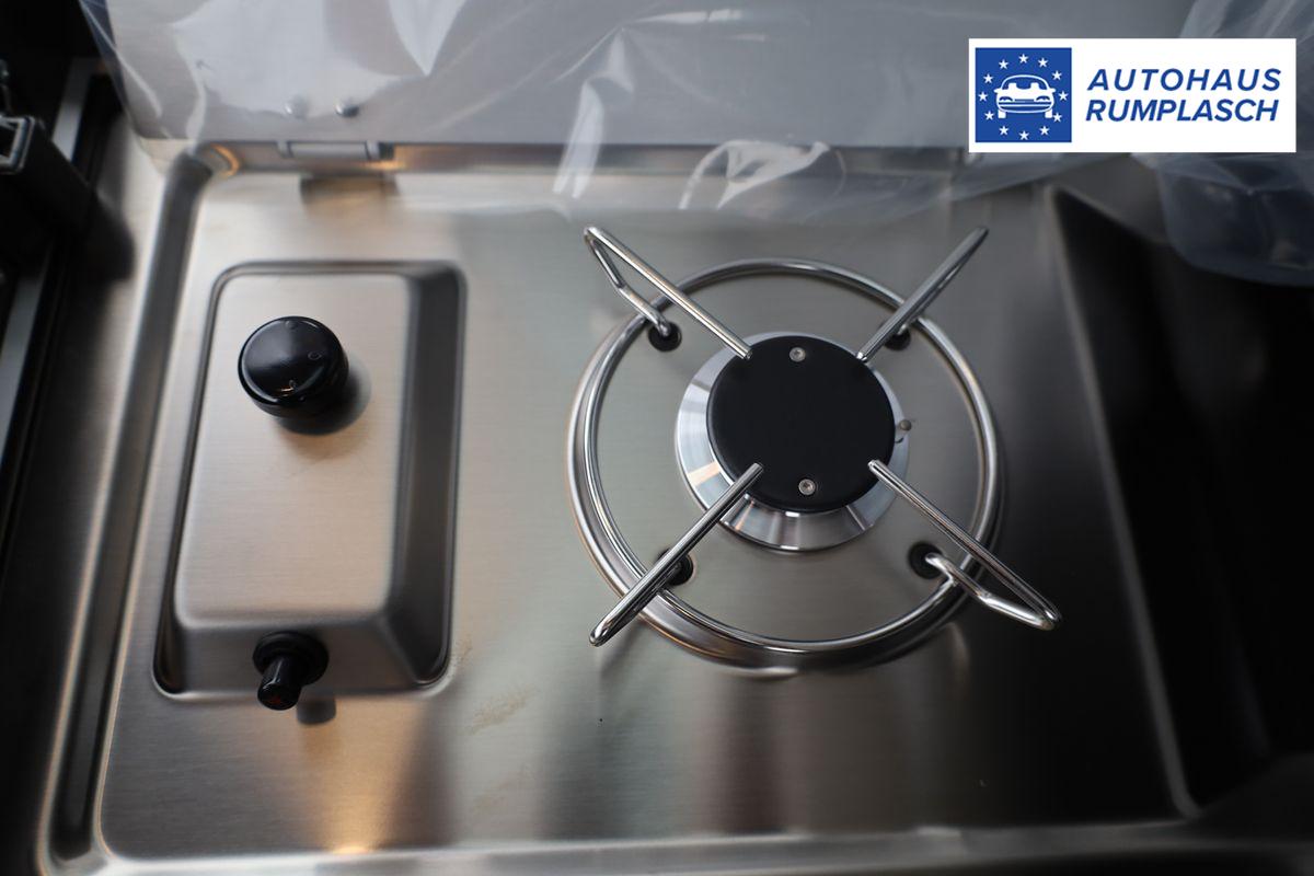 • (II2) Miniküche am Heck, mit ausziehbarem einflammigen Gaskocher inkl.Technikbox mit Camper Batterie, 230-Volt-Steckdose